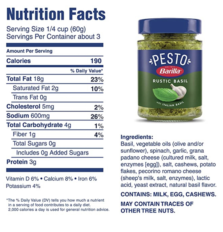 BASIL, SUNFLOWER OIL, SPINACH, GARLIC, GRANA PADANO CHEESE PDO (CULTURED MILK, SALT, ENZYMES, [EGGS]), SALT, CASHEWS, POTATO FLAKES, PECORINO ROMANO CHEESE PDO (CULTURED MILK, SALT, ENZYMES), LACTIC ACID, YEAST EXTRACT, NATURAL BASIL FLAVOR.