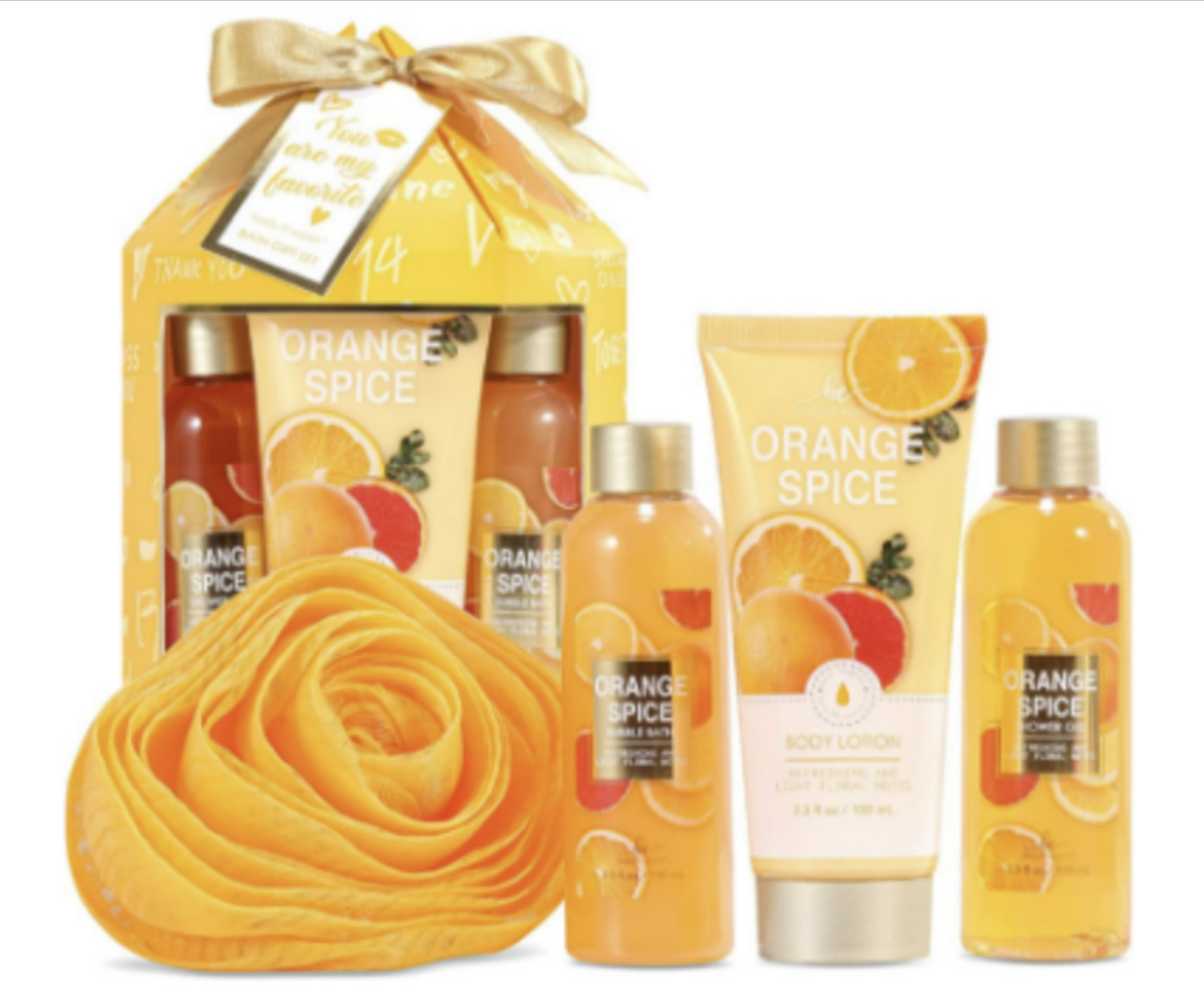 The spiced citrus aromas of our Orange Spice Fragrance is refreshing and sweet. This set has all of the components needed for an at-home spa day in this beautiful, long-lasting fragrance!