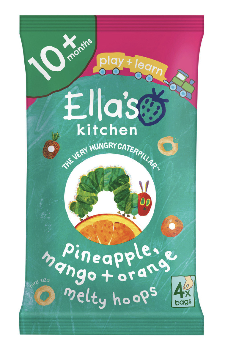 Hello, I'm organic pineapple, mango + apple maize hoops, nicely cocooned in 4 handy bags. The Very Hungry Caterpillar™ has eaten through me and made a hole! I am a fun finger food made for playing and learning with less mess. Perfect for little ones to nibble their way through when they are very hungry too!