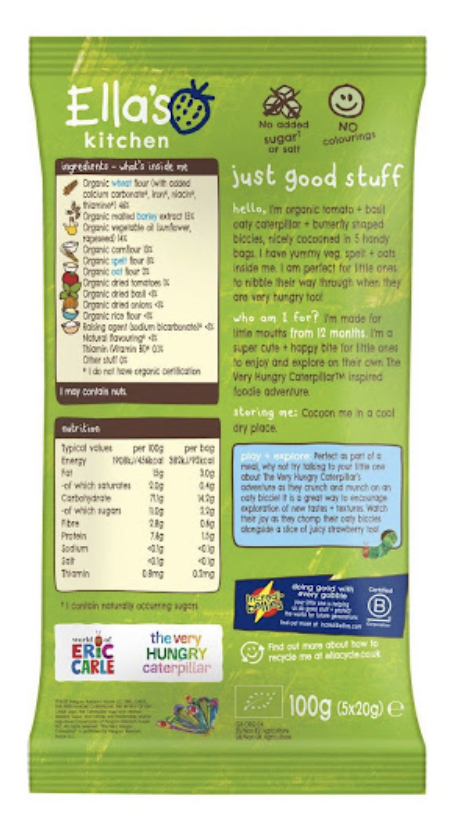 Hello, I'm organic tomato + basil oaty caterpillar + butterfly shaped biccies, nicely cocooned in 5 handy bags. I have yummy veg, spelt + oats inside me. I am perfect for little ones to nibble their way through when they are very hungry too!