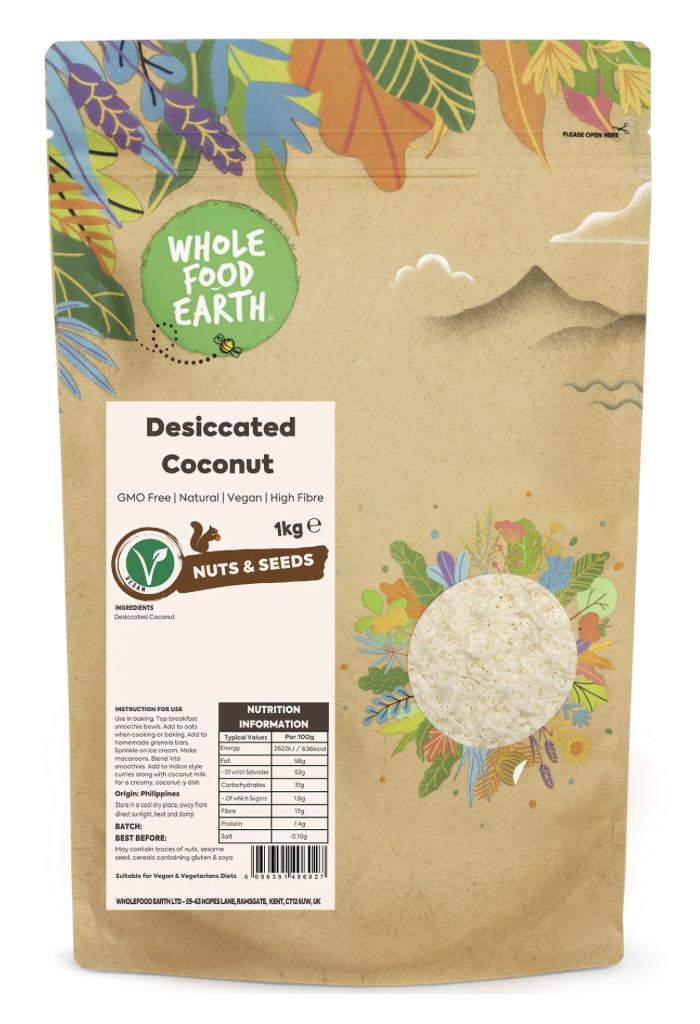 Desiccated coconut comes from fresh coconut meat that has been grated and carefully dried while preserving all its natural and beneficial properties. Coconut will never fail to add flavour to various foods, infusing them with its plentiful nutrients and exotic flavours along the way. One special weapon that desiccated coconut has above other types is its ability to add texture and "bite" to sponges and other desserts so it's beneficial to have around for making raw, vegan or gluten-free desserts.