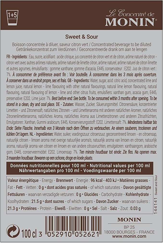 MONIN Sweet and Sour helps to recreate bar quality cocktails every time. Sweet and Sour is a ready to use product made of pure sugar, Sicilian lemon juice and a touch of lime juice. It allows the user to create perfect margaritas, sours and other classic cocktails. Its as simple as Mix, Shake, Pour! Using MONIN Sweet and Sour in a range of shaken cocktails will help to produce a foam on your drinks to create added mouth feel and texture. MONIN Sweet and Sour is perfect to be used in shaken cocktails and mocktails.