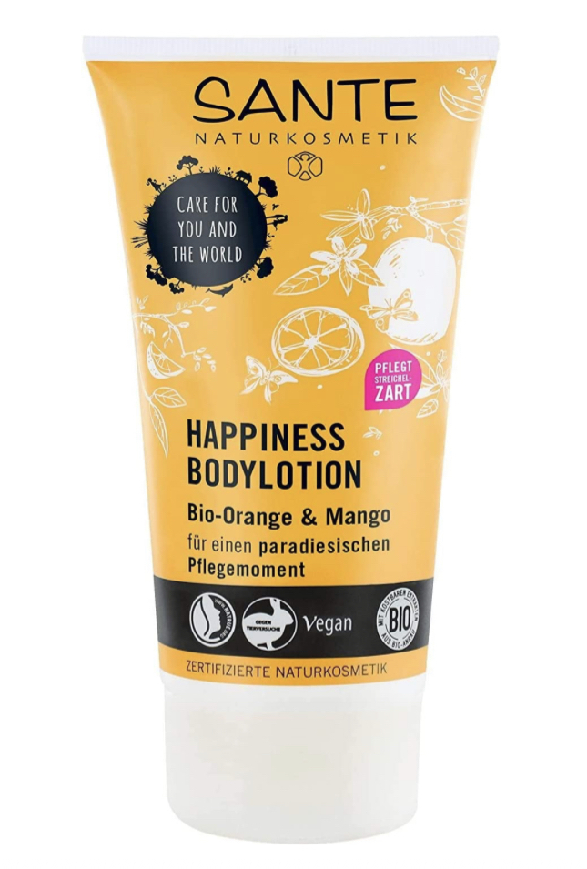 The SANTE HAPPINESS BODYLOTION Organic Orange & Mango with its tropical fragrance supplied normal and dry skin with valuable moisture . The mild formula with organic jojoba oil and organic Cupuacu butter nourishes the skin supple soft and makes it noticeably soft . A sunny fruity care experience