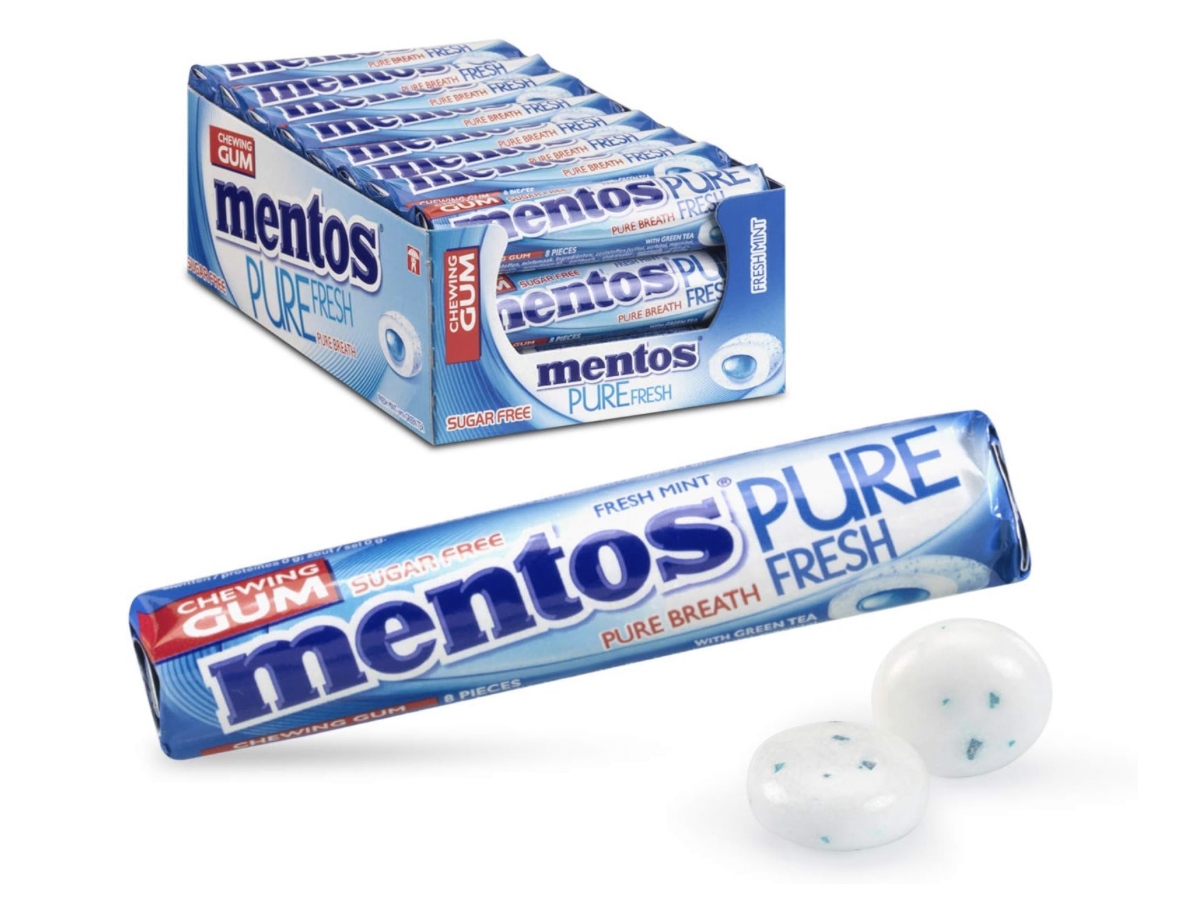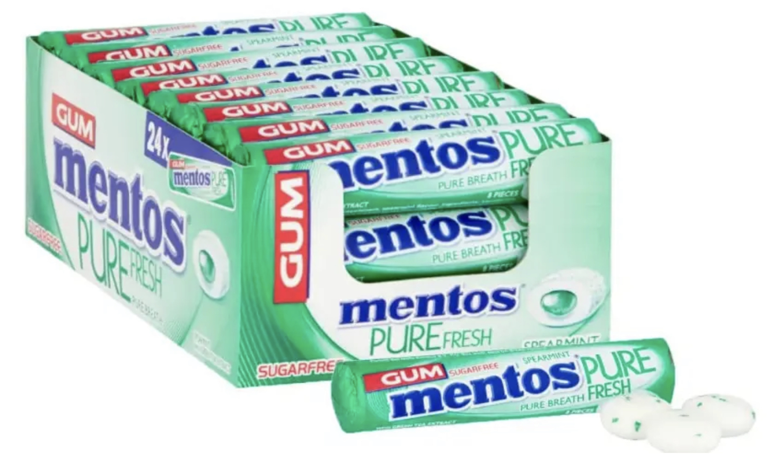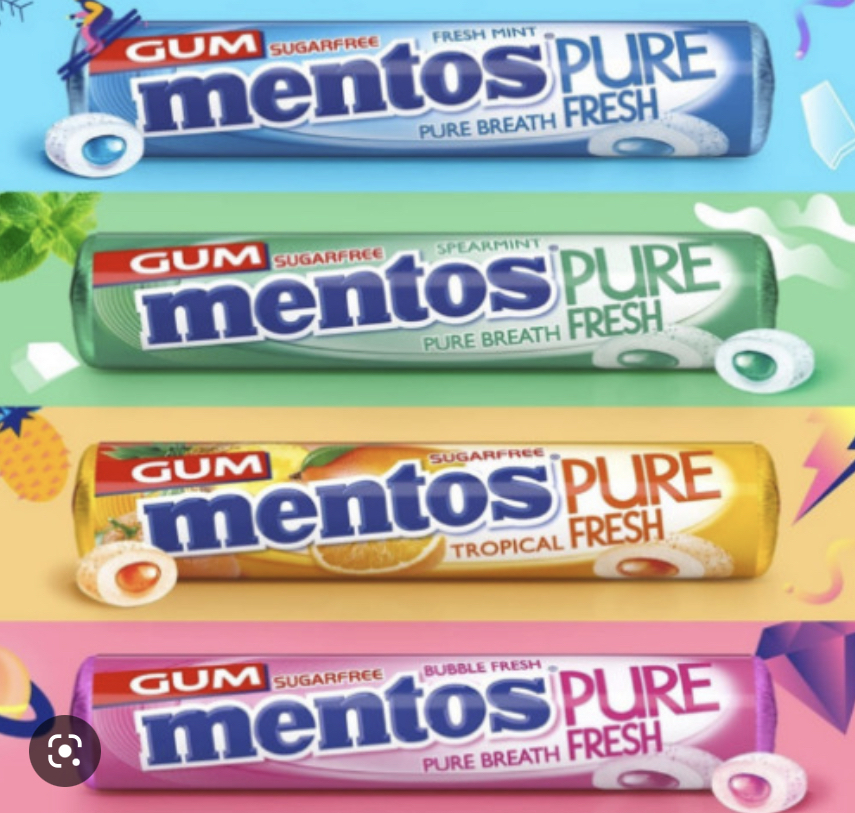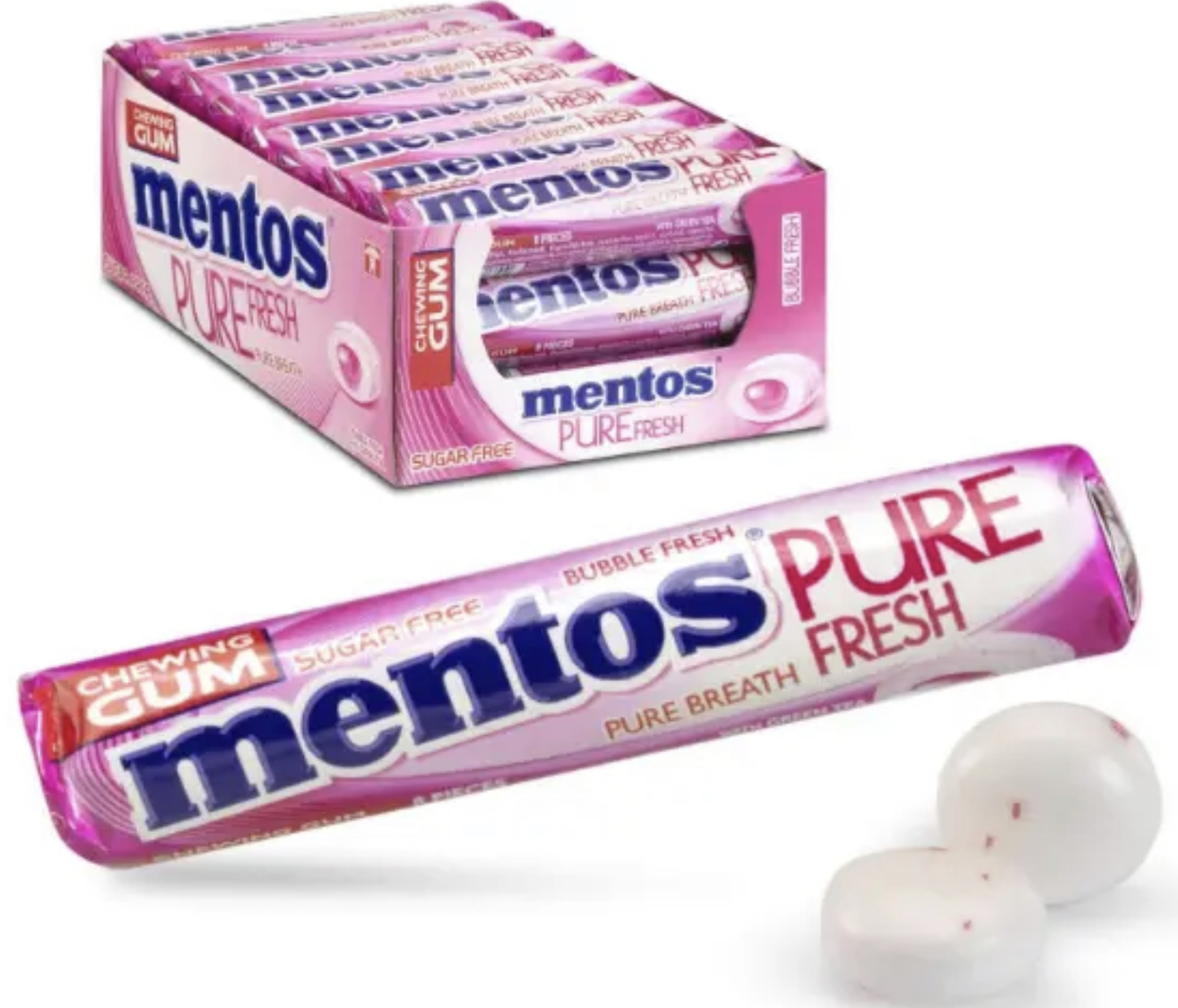 Discover the refreshing taste of Mentos Gum Pure Fresh series. Mentos Gum Pure Fresh has a unique liquid centre, providing a long-lasting gum bursting with flavour and freshness. Mentos Gum Pure Fresh is completely sugar-free, and is suitable for both vegetarians. Now available in a handy roll containing 8 pieces, great for on-the- go, giving a burst of fruity freshness when you need it most.